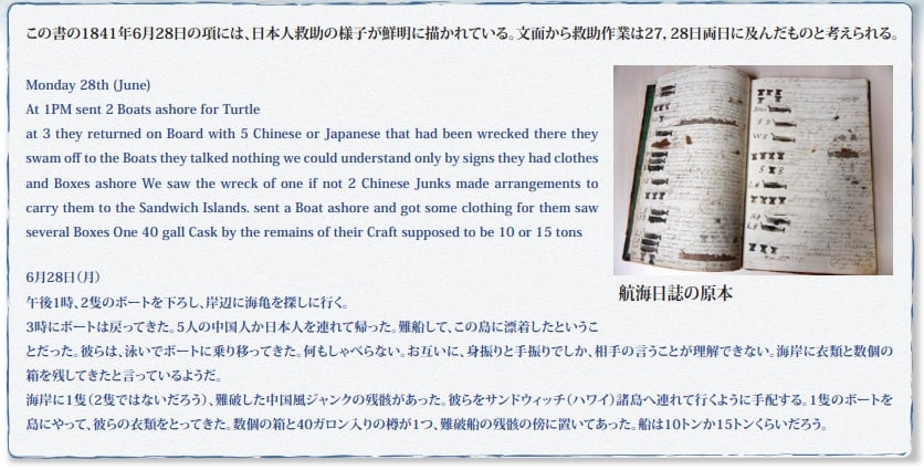 11月26日、ウィルクス大尉らは土佐の漂流民と出会う。「日本人は背が低く、知性に欠けている。彼らは多分下層階級の漁師であろう」という印象を受けた。画家アガテは日本人の一人をデッサンした。絵の主は万次郎か。