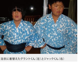 僕の名前はグラント・ナカムラ。カリフォルニアのサンフランシスコに住んでいます。年齢は8歳で小学校3年生です。僕とお兄ちゃんは日本の松島で初めて公衆浴場(温泉)に入りました。部屋で浴衣に着替え、スリッパを履いて行きました。大浴場に入る時に「刺青禁止」という注意書きが貼ってあるのに気がつきました。多分日本人は刺青を見たくないのでこのような決まりがあるのだと思います。